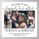 Bienvenidos a los invitados a la boda con un elegante cartel cuadrado de 24"x24" con un collage personalizado de 5 fotos. Las imágenes y el texto son fáciles de personalizar. (CONSEJO DE UBICACIÓN DE IMAGEN: Una forma fácil de centrar una foto exactamente como la desea es recortarla antes de subirla al sitio web de Zazzle.) El diseño moderno minimalista en blanco y negro presenta cinco imágenes de su elección, una elegante caligrafía con estilo de escritura a mano, tipografía vintage elegante, un corazón de lámina de oro falso lindo y un mensaje personalizable que dice "bienvenidos a nuestro feliz para siempre". Este letrero de entrada de boda es una forma elegante de compartir fotos de compromiso mientras agrega un toque personalizado a las decoraciones de la celebración de su día especial. ¡Felicitaciones a la novia y al novio!