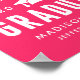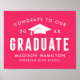 Moderno poster de graduación con letras blancas en negrita y fondo rosado caliente. El diseño presenta un tapón blanco de graduación con la frase "Felicitaciones a nuestro graduado". Personalice el cartel de graduación rosado con el nombre del graduado, el nombre de la escuela y el año de graduación. Para obtener un aspecto más personalizado, cambie el fondo a los colores de la escuela. ¡El poster de graduación es perfecto para su fiesta de bachillerato o de graduación universitaria!