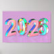 Tarjeta de Feliz Año Nuevo 2026 con números metálicos coloridos sobre fondo púrpura brillante