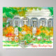 Un poster "Happy Thankscome" decorado con coloridos follajes otoñales que crecen a lo largo de una valla ajardinada frente al porche de una casa blanca con árboles altos en el patio lateral dibujado con pluma, tinta y acuarela.
