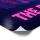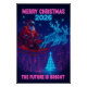 Futurista diseño poster de Navidades, Santa Claus usando un moderno traje rojo con detalles brillantes y auriculares VR, montando un trineo volador de alta tecnología jalado por el cibernauta neón