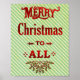 Este festivo diseño poster incluye las palabras "Feliz Navidad a todos" en letras rojas brillantes con varios tipos de letra y florecientes. En la parte inferior, hay un mistletoe más grande que florece con hojas verdes y bayas rojas pequeñas. Todo esto descansa sobre un fondo rayado verde claro hecho para lucir descolorido / moteado y moteado de una manera vintage / antigua. Se trata de un poster sencillo y elegante, de estilo antiguo, para decorar la pared durante las vacaciones de invierno navideñas. Vea los artículos coincidentes en nuestra tienda.