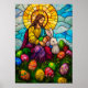 Arte de Cristal Manchado de Jesucristo con un lindo conejito de Pascua y vibrantes huevos de Pascua. Animales de conejo para la resurrección de la religión cristiana. Feliz Pascua con Jesús.