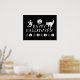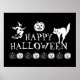 Feliz truco espeluznante de Halloween o trato espeluznante decoración poster blanco y negro, jack o linterna, calabaza, bruja, fantasma, cráneo, luna, gato negro