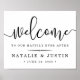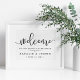 Bienvenido a su boda con nuestro poster de moda, disponible en varios tamaños. El diseño presenta tipografía negra en blanco nítido con "bienvenida" en la parte superior en un elegante guión caligráfico escrito a mano, y "...a nuestro feliz siempre después" y sus nombres y la fecha boda debajo.