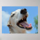 Fotografía de un galgo con la boca abierta y los ojos escupiendo en una sonrisa de perro feliz.