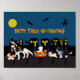 ¡Un grupo de gatos y perros hacen trucos o tratan la Noche de Halloween! Los mascotas de este diseño incluyen un cachorro Akita Inu vestido de vaquero, un gato forestal noruego con una corona de princesa, un Husky siberiano jalando un vagón con una calabaza en él, un gato persa vestido de ángel, un papillón, un perrito, un basenji, un pomerano vestido de bruja y un collie vestido de perro de policía. Mientras tanto, ¡murciélagos y brujas están volando por encima del vecindario bajo una luna llena! Este diseño se puede personalizar o personalizar agregando tu propio texto o imágenes.