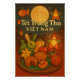 Poster festivo de estilo retro de la noche del Festival de Mediootoño de Vietnam, enfocándose en un mâm crecung Thu (mesa de fiesta del festival) bien arreglado. En la bandeja: tortas de luna tradicionales (bánh trung thu) con loto y relleno de frijol rojo, frutas con forma de animales (pomelo tallado en conejo, fruta de las estrellas, plátanos, manzanas, fruta del dragón),