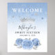Crea tus propios bellos carteles fiestas personalizados de bienvenida usando una elegante plantilla DIY que es simple de diseñar. El cuento de hadas de arte floral de Raphaela Wilson cuenta con un suave patrón de acuarela de rosas de color azul claro, una corona de princesa de Cenicienta plateada / tiara y confetti de mariposa purpurina brillante. Al personalizar aún más estos posters de señalización de bienvenida azul claro y plata, puede alterar las opciones de plata metálica al oro, e incluso seleccionar colores personalizados para la corona svg, mariposas y más. Ya sea que sea un polvoriento boda azul; quinceanera / membrillo de invierno, fiesta de 16 años de Cenicienta dulce, fiesta de graduación, ducha de novia, ducha de bebé de príncipe real / princesa, u otro día especial, estos posters florales personalizados de bienvenida pueden agregar ese elegante brillo que estás buscando! Categoría: posters de bienvenida de tamaño personalizado para fiestas de cumpleaños / bodas; decoración interior de boda de bienvenida / posters para una dulce fiesta de dieciséis años; y carteles únicos de bienvenida con rosas azul claro. Plata y quinceanera azul cielo: azul claro, pastel azul bebé, azul polvoriento, gris plateado, negro y blanco (con opciones de oro metálico falso).