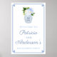 Flores Azules Clásicas y Blancas en un jarrón de jengibre decoran el diseño de esta señal de bienvenida de la fiesta. Se muestra aquí para una fiesta de compromiso, pero todo el texto se puede personalizar según sus necesidades.