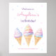 fiesta de cumpleaños de bienvenida poster con ilustracion helado dulce en tonos pastel.