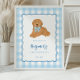 Bienvenidos a sus invitados de la manera más dulce con este cartel de primer cumpleaños de golden doodle con gingham azul. Con un adorable cachorro golden doodle con un lazo gingham azul y un fondo clásico a cuadros, este cartel de cumpleaños personalizado añade un toque emotivo al día especial de su pequeño.