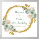 Hermoso poster de fiesta de cumpleaños con un marco de purpurina verde sabio y falso dorado con arreglos florales. Las palabras se pueden cambiar para adaptarlas a sus propios detalles o requisitos