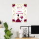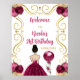Este cartel de bienvenida para la fiesta de cumpleaños incluye un marco dorado elegante, una bella princesa con el pelo castaño y un vestido rojo borgoña, flores y un globo. Esto es perfecto para una fiesta de cumpleaños.