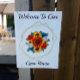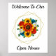 Poster fiesta de verano con temática floral de girasol y marco geométrico de oro