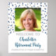 Personalizado foto fiesta de retiro poster con confeti plateado y azul.