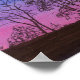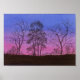 Una pintura acuarela ACEO de una vieja fila de vallas y árboles otoñales colocados contra el rosa y el azul más profundo de la noche, cielo crepúsculo.