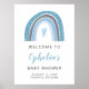 Este cartel de bienvenida para una ducha de bebé presenta un arcoiris azul polvoriento bohemio y tipografía de escritura tipográfica. Todo el texto es editable para responder a cualquier necesidad de evento - ducha de bebé, ducha de novia, fin de semana de soltera, etc.