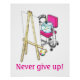 A goldfish inside a fish bowl siting on an old magenta-colored rolley office chair. The fish is wearing a helmet with a transmitter to control the robot arms attached to the bowl. It decides what to paint on its canvas-on-an-easle as it dips a brush in water (in the fish bowl). Also features digitally simulated watercolor effect. Text says, "Never give up!" and is customizable.