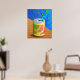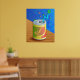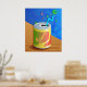 Ilustracion de una bebida refrescante enlatada con una paja y burbujas saliendo de ella descansando sobre una mesa de madera. Imagen disponible en varios regalos y productos. Posters. Impresiones.