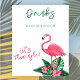 El diseño de la invitación a la ducha para bebés incluye flamencos rosas con frontales verdes de hojas de palma y flores de hibisco tropicales. "Aloha Baby". Un patrón floral tropical con color de fondo negro se viste por la parte posterior de la tarjeta. ¡Vamos Flamingle!