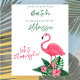 El diseño de la invitación a la ducha para bebés incluye flamencos rosas con frontales verdes de hojas de palma y flores de hibisco tropicales. "Aloha Baby". Un patrón floral tropical con color de fondo negro se viste por la parte posterior de la tarjeta. ¡Vamos Flamingle!