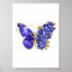 Joyería, azul, zafiro, mariposa floral brillante con ala decorada con flores azules y preciosas con hojas de oro sobre fondo blanco.