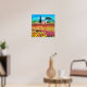 Paisaje toscano, colorido, vibrante, expresiva belleza del campo italiano y campos en naranja amarillo brillante, rosa, fucsia, púrpura, rojo, verde, marrón, amarillo, hermosa flora de verano, prados, flores, cipreses y olivos, antigua granja rústica bajo el cielo azul. Pintura acrílica sobre lienzo.