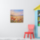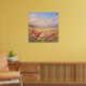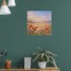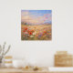 Artwork of a wind swept field of flowers in a pastel painting style. This artwork captures the essence of a warm summer breeze through a vibrant meadow of red poppies and wild daisies, carrying delicate petals up into the sky. The soft, painterly texture and warm, golden light evoke a sense of peacefulness. It is the perfect piece to brighten up a living room or any space that could use a touch of nature's beauty. The composition is grounded by a dense, textured foreground of brilliant red poppies and white daisies, guiding the viewer’s eye upward as scattered petals dissolve into a soft, sky of peach, lavender, and pale blue. The contrast between the highly detailed, saturated flowers in the foreground and the hazy, dreamlike distant hills creates a sense of depth and vitality.