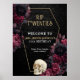 Fije el tono para la celebración de su hito con este Signo de bienvenida gótica RIP Twenties. Diseñado con texturas adamascadas negras de gótico vintage, flores de borgoña y ciruela, acentos de marco dorado y un ilustracion de cráneo, este diseño audaz es perfecto para un fiesta dramático de 30 años. El diseño editable facilita el personalizar con el nombre y los detalles del fiesta. Ideal para saludar a los huéspedes en la entrada, bar o fondo fotográfico, este cartel le da un toque gótico inolvidable a su fiesta de halloween para adultos o "Muerte a mis veinte años".