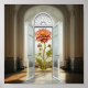 Este arte imaginativo presenta una fascinante fusión de arquitectura clásica y naturaleza surrealista. En el interior de un gran salón ornamentado con techos altos y ventanas abovedadas, dos elegantes puertas de cristal se abren para revelar una flor enorme y enorme en plena floración. Los pétalos rosa y melocotón vibrantes contrastan con el refinado interior clásico, que simboliza el poder de la naturaleza que se libera del confinamiento. La yuxtaposición surrealista entre los elementos naturales y arquitectónicos evoca una atmósfera de ensueño, invitando a los espectadores a reflexionar sobre el equilibrio entre las creaciones humanas y el mundo natural.