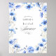 Bridal Shower poster de bienvenida con caligrafía elegante y un marco floral de color agua de flores azul bonito. La plantilla está configurada para que puedas personalizarla y también puedes cambiar el tipo de ducha por ducha de matrimonio o ducha de pareja, por ejemplo. Este delicado diseño de ducha de matrimonio en azul y blanco es perfecto para los temas de ducha de novia azul, los temas botánicos y las duchas de boda primavera o verano. Para coordinar invitaciones, papelería y decoración del día del evento, por favor visite mi Colección de Ducha de Brigada Floral Azul de Algo o envíeme un mensaje para añadir cualquier artículo adicional que necesite.