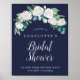 Este clásico poster de bienvenida con flores blancas y ducha de novia marina es perfecto para una ducha de boda en otoño. El elegante diseño floral presenta rosales blandas de marfil y blanco, peonías y crisantemo con toques de flores de acuarela azul perwinkle y follaje verde. Personalizar el poster con el nombre de la novia, días hasta el boda, fecha de ducha y etiqueta opcional de medios sociales para fotos.