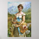 Retrato de una bella dama con cinta azul, gorra de paja, flores blancas y paisaje alpino. pintura al óleo del siglo XVIII.