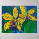 Poster con boceto floral expresivo en colores llamativos, flores orquídeas amarillas brillantes con pétalos puntiagudos sobre fondo azul profundo. Pintura pastel, 2021 © Clipso-Callipso / Julia Khoroshikh www.juliakhoroshikh.art #floralart #contemporaryfloral #abstractbotanical #yelloworchid #orchidflowers #expressionism #posters