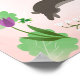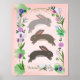 Tres conejos saltados recorren con humor el jardín con un fondo rosa y ruidoso, decorados con hojas de col verde, tréboles, tulipanes morados y panes violetas. Ilustracion original de Noël Snow