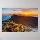 Esta asombrosa foto de Getty Images muestra plantas florecientes sobre rocas en el pico de Pico de la Zarza bajo el cielo ardiente al amanecer, Fuerteventura, Islas Canarias, España