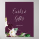 Esta señal de tarjetas y regalos de floración de color púrpura temperamental es perfecta para una boda moderna o una ducha de novia. El diseño floral elegante presenta flores de tulipán púrpura ciruela oscura y blanca con hojas verdes esmeralda y acentos de hoja dorada. La línea de texto en la parte inferior de la señal se puede personalizar con la fecha, los nombres de la novia y el novio, o un mensaje corto como "Gracias". Esta señal se puede utilizar para una boda o cualquier evento o fiesta.
