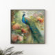 Poster con la pintura vintage de un elegante pavo real azul y verde en un exuberante bosque de flores y vegetación rosa.