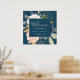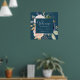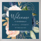 Este boda poster de bienvenida con flores de color azul marino es perfecto para un boda floral. El diseño es clásico y elegante, con un fondo azul verde azulado, y está decorado con un acuarela de color azul marino moderno y flores rosas rubias. Personalizar el poster con el nombre de la novia y el novio, y la fecha del boda.