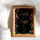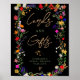 Flores silvestres modernas boho brillantes tarjetas de novia y regalos firman señal bohemia de ducha de novia signo de bienvenida. Flores botánicas de tonos rosa, rojo, verde y morado inspiradas en flores silvestres y jardines rústicos acuarelas con vegetación sutil y tipografía moderna de escritura boho sobre negro.