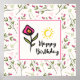Un soleado y feliz poster de cumpleaños con un marco cuadrado con un borde rosado que dice "Feliz Cumpleaños" escrito con una letra de moda con un sol amarillo encima y una flor rosa bonito a un lado. El telón de fondo es un patrón sin fisuras con flores silvestres rosas dibujadas a mano con tallos verdes largos y hojas sobre un fondo de color blanco concha de huevo. El diseño también está decorado con círculos y estribos rosas. Diseño cuidado y veraniego.