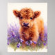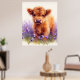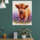 Celebre la belleza pastoral de Escocia con este poster mostrando un becerro de vaca Highland rodeado de flores silvestres violetas. Perfecto para añadir encanto rústico a cualquier espacio, captura la esencia serena de la campiña escocesa con un detalle vibrante.