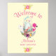 Poster de bienvenida con ducha para bebés ilustrado con elementos florales rosas y verdes. Diseñado con un bonito huevo acuarela sentado en una cesta de mimbre marrón. La cesta está decorada con cintas, arcos, flores y pequeños corazones. Un flamingo rosa y un conejo blanco parado cerca.