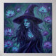 Bruja enigmática con sombrero de ala ancha entre flores moradas brillantes, paleta azul-púrpura etérea, cabello oscuro fluyendo y mirada mística.