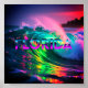 A glowing neon wave sweeps across a tropical Florida horizon, radiating electric blues, hot pinks and vibrant purples. The curve of the wave pulses with retro‑futuristic light, echoing the energy of Miami nights, ocean breezes and the iconic 80s synthwave aesthetic. Palm silhouettes shimmer at the edge of the glow, while the water reflects streaks of neon like liquid light. The scene captures the spirit of Florida as a place of color, motion and endless summer — a fusion of coastal freedom and bold, luminous style.