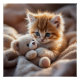 Cute, fluffy red kitten playing with a tiny, soft teddy bear on a cozy, warm blanket. Pretty colors in orange, beige, white. Adorable design for any child!