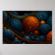 Una fascinante obra de arte digital con brillantes esferas azules y naranjas enclavadas en estructuras giratorias tipo cinta. La composición evoca un universo fantástico o un mundo microscópico, rico en textura y profundidad. Perfecto para los amantes del arte abstracto, los temas cósmicos y la narración visual vibrante.