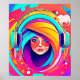 Una mujer colorida con audífonos, rodeada de energía giratoria, evoca la alegría del sonido y la expresión creativa (Este diseño hecho con IA). ¡Haga el pedido hoy y acepte la alegría de ir de compras!