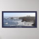 El blues blues mientras la niebla cubre la escena de la playa matutina. Las vistas al océano son tranquilas, con un contorno de costa rocosa y de los Pinos de Monterey. Pequeño poster de acentos.